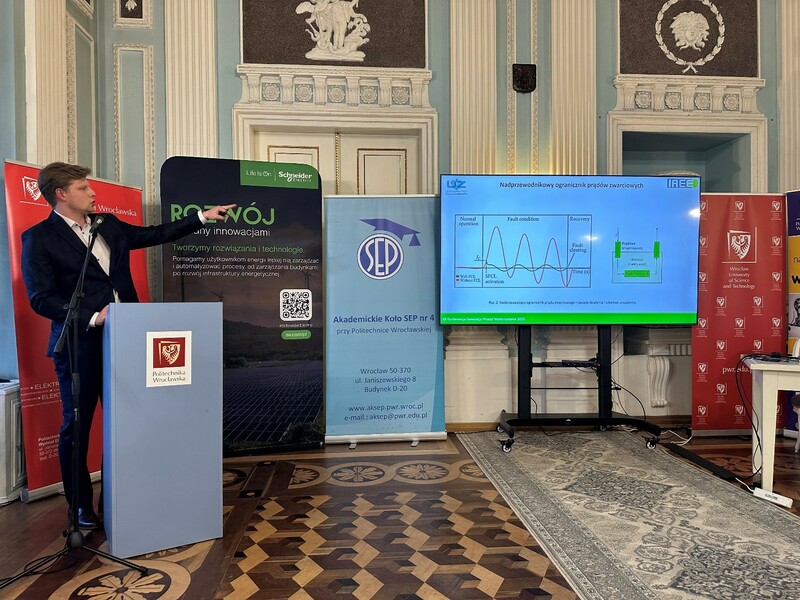 Studenci SKN SEP Uniwersytetu Zielonogórskiego wygłosili prezentację będącą efektem ich badań i pracy projektowej: „Obserwacja mikrodefektów w wysokotemperaturowych taśmach nadprzewodnikowych” - autorzy: Szymon Polegaj, Grzegorz Okupski, Oskar Kułak, opiekun naukowy: dr inż. Sylwia Hajdasz.